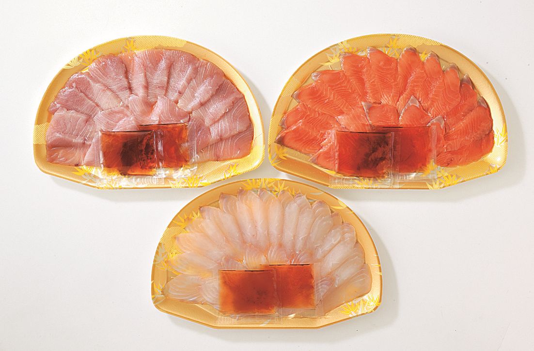 道産ヒラメ、ぶり、桜ますを鮮度を保ったままスライスし冷凍して有る為お刺し身にてもめしあがれます。 ≪冷凍≫